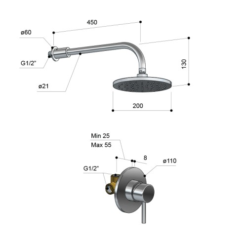 Σύστημα εντοιχισμού εξωτερικού χώρου από γυαλισμένο ανοξείδωτο χάλυβα (aisi 316) που μπορεί να τοποθετηθεί σε χώρους που υπάρχει πισίνα, που βρίσκονται κοντά στη θάλασσα. Αποτελείται από κεφαλή ντους με διάμετρο 20cm και ένα μίκτη για ζεστό και κρύο νερό. Όλο το σύστημα είναι από ανοξείδωτο χάλυβα και μέγιστη αντοχή στη διάβρωση που μπορεί να προκαλέσουν οι καιρικές συνθήκες. Κατασκευάζεται εξ' ολοκλήρου στην Ιταλία από την εταιρεία Fontealta που είναι εξειδικευμένη στη παραγωγή προϊόντων από ανοξείδωτο χάλυβα..