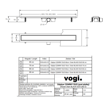 Γραμμικό σιφόνι ντουζιέρας ,με μήκος 60 cm σε μαύρο χρώμα.Πρόκειται για ένα σιφόνι με ανοξείδωτο σώμ..