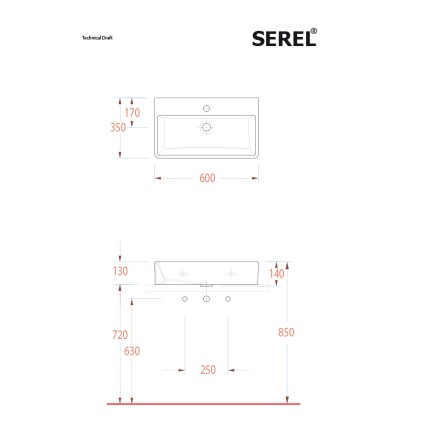 Νιπτήρας Serel Tetra 2046, διάστασης 60x35 cm, χωρίς υπερχείλιση.Μπορεί να τοποθετηθεί είτε κρεμαστό..