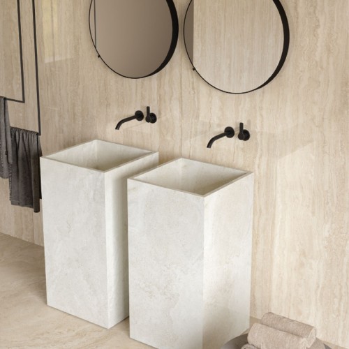 To Unique Travertine Cream πρόκειται για ένα διαχρονικό υλικό που πρωταγωνηστεί στο χώρο του μπάνιου χωρίς κανένα ντεκόρ.
