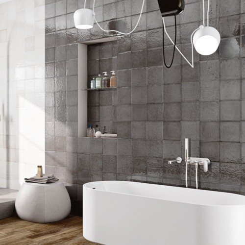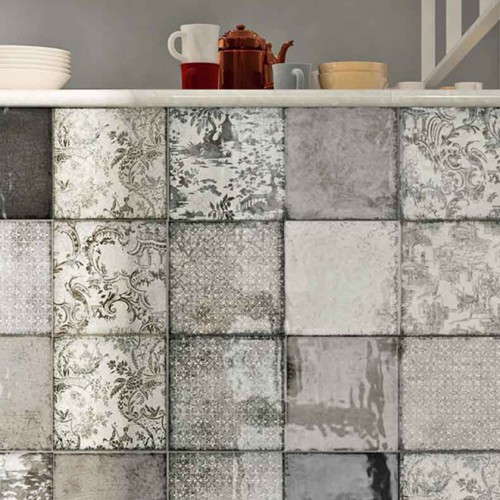 Πλακάκι 20x20 cm με γυαλιστερή επιφάνεια από την Iris Ceramica, σχεδιασμένο για να θυμίζει τα παλιά παραδοσιακά πλακάκια σε γκρι χρώμα.