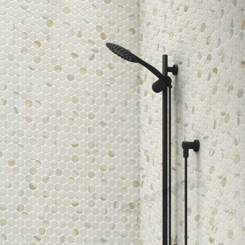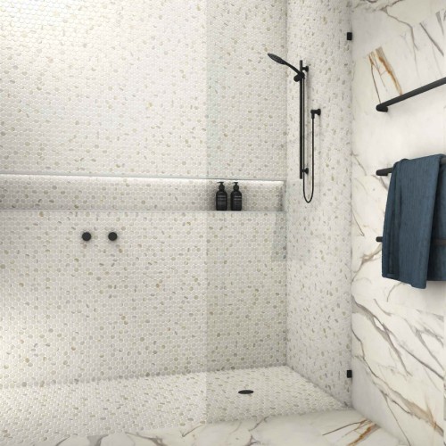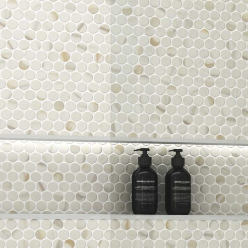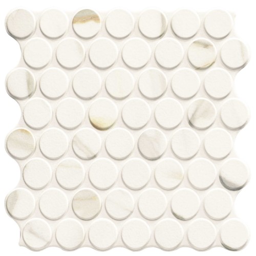 Πλακάκι με σχέδιο στρογγυλή ψηφίδα σε λευκό ματ χρώμα με νερά μαρμάρου.