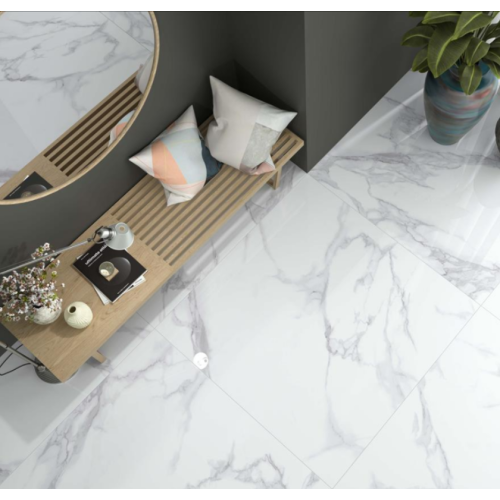 Γρανιτοπλακάκι γυαλιστερό 60x120 cm και νερά σε λευκή απόχρωση που αποδίδει την αίσθηση του μαρμάρου.