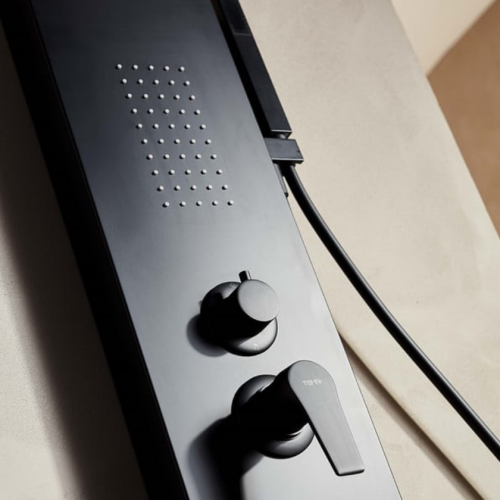 Στήλη Ντους Υδρομασάζ θερμομικτική, από ανοξείδωτο χάλυβα SS304, σε μαύρο ματ φινίρισμα.