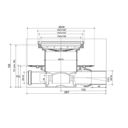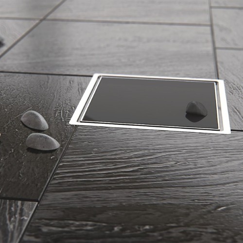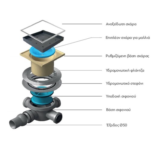 Σιφόνι δαπέδου τετράγωνο με σχάρα κατασκευασμένη από ανοξείδωτο ατσάλι.