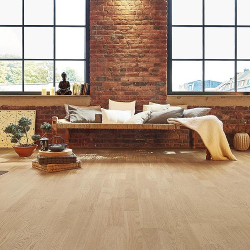 To δάπεδο είναι προγυαλισμένο με λούστρο ματ Proteco που διατηρεί το φυσικό χρώμα και την αίσθηση του ξύλου ακριβώς όπως ένα προλαδωμένο δάπεδο.